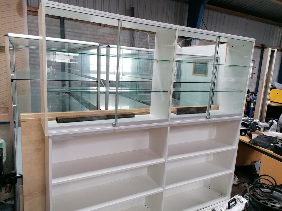 . Hvid melamin ,robust & stabil.Glas skabene er åben fra bagsiden,og kan løftes som 1 del.Til samlinger (pokaler, ure mm.) Til evt.udstilling i butik,kontor,hobby, rum deler. Levering kan aftales, mod købers betaling.