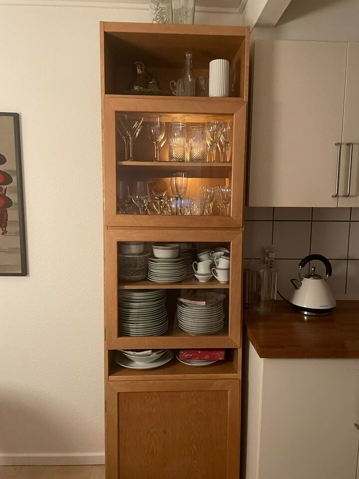 Pæne egetræsreoler, den ene med glaslåger og lys. Kan monteres på den anden hvis man ønsker “ens look”