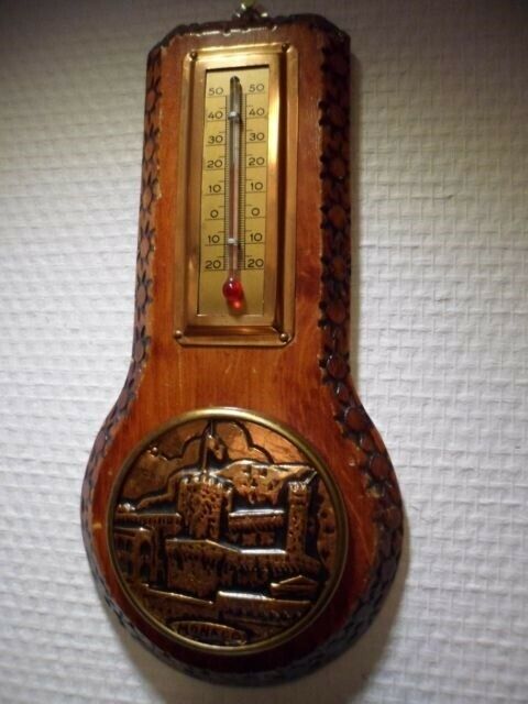 Termostat i træ med kobber skive. ligner en vikingeborg. står Monaco på længde: 21 cm bredde 11 cm.