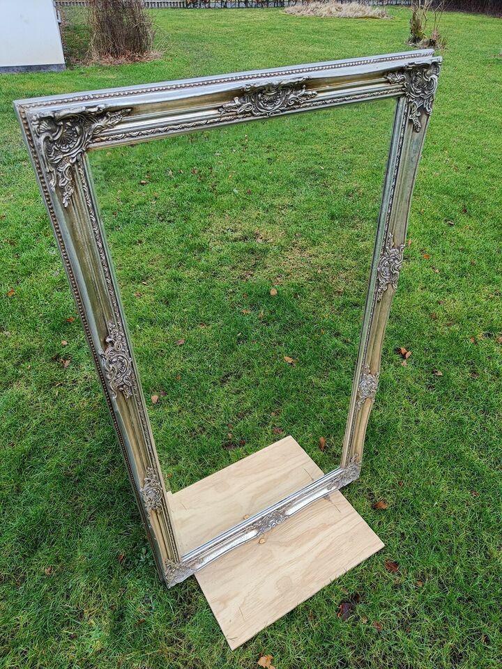 Stort super lækkert spejl med sølvfarvet ramme i gammelt look…